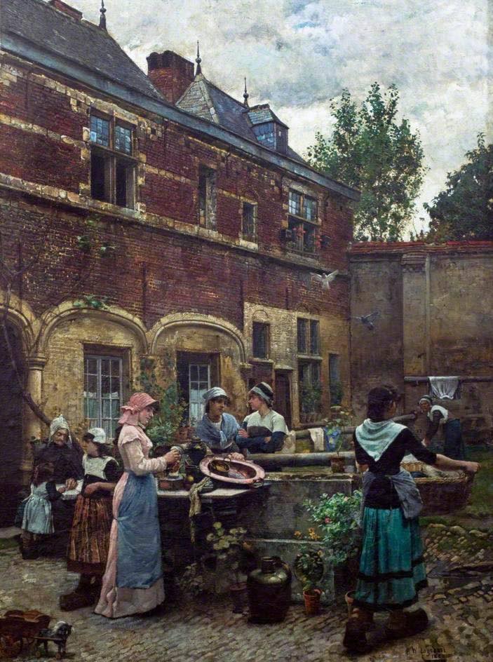 El edificio, de ladrillo, está viejo y ennegrecido por el humo del puerto, el pavimento desmantelado del patio está invadido por las hierbas, el antiguo lavadero está cubierto de moho, pero el ambiente es alegre, las mujeres jóvenes en zuecos cantan y charlan trabajando. Lavan alegremente los platos y secan la ropa en cualquier lugar. Las plantas con flores obstruyen el espacio con sus hojas y sus brotes nacientes, un hermoso árbol emerge sobre el muro, los rayos de color gris azul de un cielo donde los blancos cúmulos se amontonan ampliamente. Dos palomas revolotean antes de aterrizar en este lugar donde la vida abunda, una anciana frente a la puerta sentada con el libro abierto en su regazo enseña a leer a una niña que ha dejado su juguete tirado en una esquina.