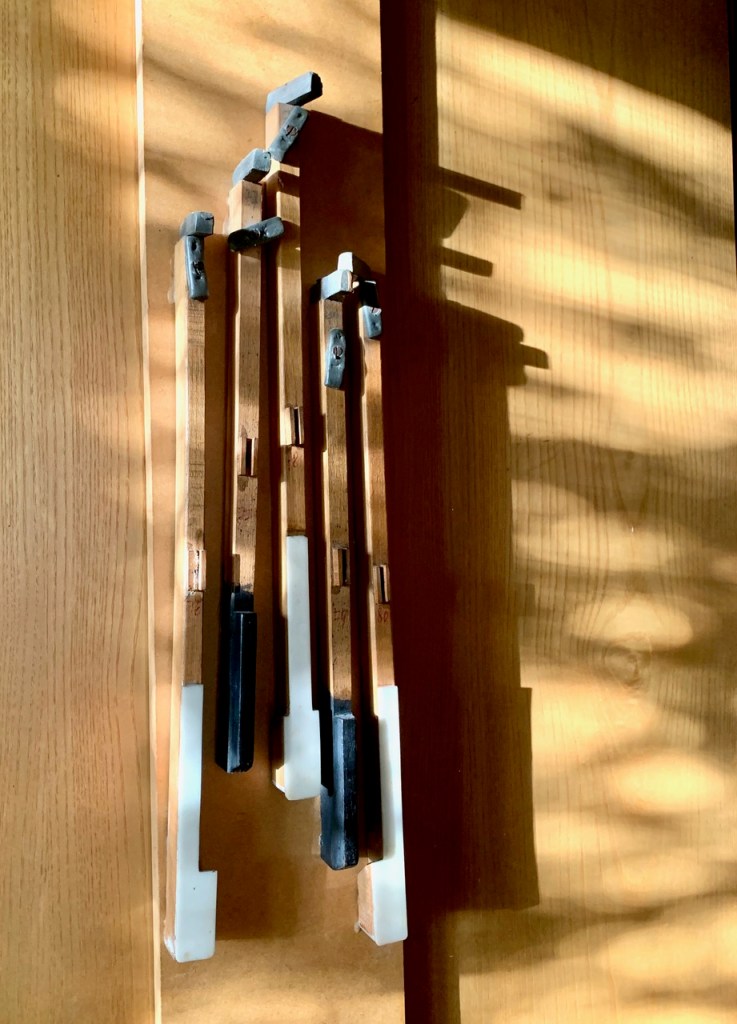 Este teclado sin cuerdas fue apodado en familia “el piano mudo.” Es donde mi padre, en mi temprana adolescencia, se ejercitó en partituras variadas para mantener, como decía, la agilidad en los dedos. Tiempo después, Yolanda y él se separaron. El hombre logró al final comprarse un piano verdadero. Cuando murió, encontré en el desván de su departamento una caja grande de cartón con el viejo teclado desmontado. Volví a mi hogar, al otro lado del océano, con algunas teclas en la valija y fabriqué con ellas una especie de escultura que hoy cuelga en la puerta de mi pieza. Cada vez que la miro siento algo que vibra, el eco, quizás, del hombre frente al teclado mudo que en aquel cuarto lejano sigue tocando Bach.