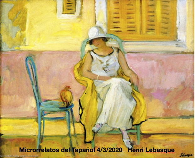 Estaba visitando la exposición de los impresionistas cuando un cuadro atrajo mi atención: era Mujer en vestido blanco de Henri Lebasque. El cuadro me hizo recordar cuando era niña y el sábado en que terminaba la escuela mis padres me llevaban a la casa de campo de mis abuelos donde yo pasaba las vacaciones hasta agosto que me venían a buscar para ir con ellos al mar. Yo entraba corriendo, gritando: ¡abuela María! Mi abuela me esperaba siempre en el patio vestida de blanco con Juan, que era una paloma que vivía allí.