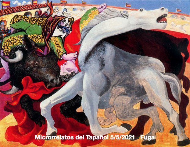 Atrevido es mi nombre y realmente lo soy. En este momento estoy recibiendo palizas con sacos de arena, me duelen mucho, no entiendo por qué puesto que me estoy portando bien. Ahora van a abrir la puerta de toriles, me toca a mí salir al ruedo. La voz me persigue: <date prisa, date cuenta de que estás en peligro, no te hagas el héroe>. De pronto al entrar en la arena todo se hace evidente. ¡Qué estupidez pensar que fuera una fiesta! debo de estar completamente loco. Claro está que se trata de un espectáculo sangriento y cruel. Siento que se desvanece instantáneamente la alegre excitación causada por mi ingenuidad de joven novillo. Entonces sorprendiendo al público, que se queda callado, a los picadores y sobretodo al hombre del traje de luz, rompo el vallado y me doy a la fuga. Cruzo calles y avenidas corriendo sin saber para donde estoy yendo. Quisiera llegar a los recintos del campo y avisar a todos de lo que pasa en estas fiestas, quisiera retomar mi libertad y celebrar el peligro evitado, y sobretodo quisiera agradecer a la voz que me había llamado a la realidad. Un viento fuerte sigue soplando en la ciudad, pero ahora sólo trae voces gritando ¡Toro a la fuga!