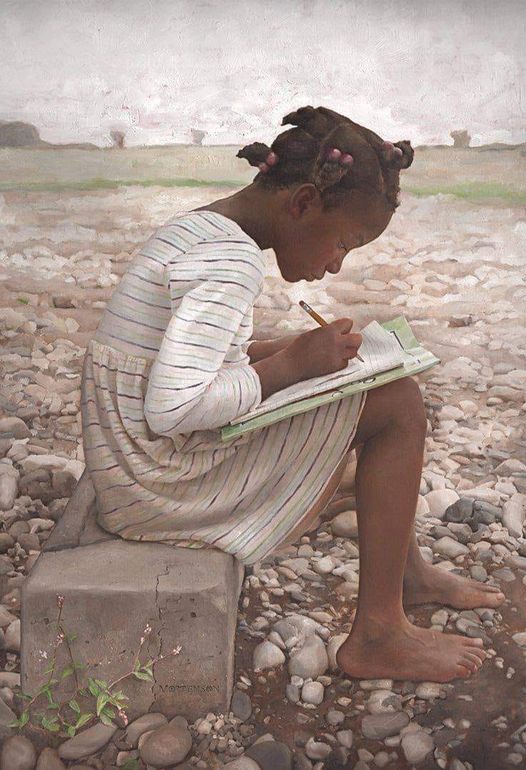 Eso me pareció surrealista. En un escenario de destrucción, un poco apartada, una joven haitiana, bien cuidada y hermosamente vestida con los pies descalzos, estaba sentada sobre lo que podría haber sido una de esas piedras que se utilizan para bordear las aceras. Estaba inclinada sobre su texto, lo corregía a lápiz. A su alrededor no había más que desolación, detritus, piedras, hierba chiflada, latas de conservas vacías, a lo lejos había un humo espeso que nublaba la atmósfera y al que se debían sin duda estos malos olores poco tranquilizadores. Y ella con su pelo muy crespo recogido en pequeños mechones cuidadosamente sujetados por pequeñas pinzas que parecían un par de cerezas.